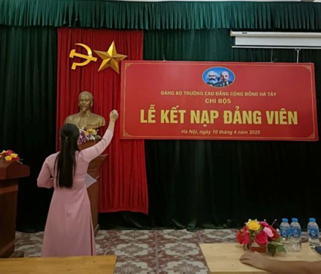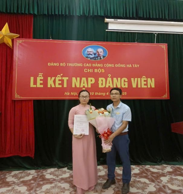 Căn cứ điều 4 Điều lệ Đảng Cộng Sản Việt Nam. Thực hiện quyết định số: 3092-QĐ/ĐUK ngày 13/3/2025 của Đảng ủy khối các trường ĐH, CĐ Hà Nội. Ngày 10 tháng 4 năm 2025, chi bộ 5 tiến hành tổ chức lễ kết nạp Đảng viên cho quần chúng Đinh Thị Thùy Dung. Buổi lễ diễn ra trong không khí trang nghiêm, đúng quy định của Điều lệ Đảng, là dịp để toàn thể Đảng viên ôn lại lý tưởng cao đẹp, thiêng liêng của người cộng sản và chứng kiến sự trưởng thành, rèn luyện của thế hệ tiếp nối.
