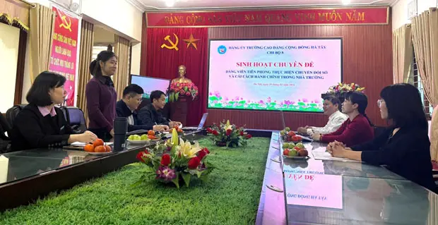 Ngày 30/01/2026, Chi bộ 8 tiếp tục tổ chức sinh hoạt chuyên đề theo Hướng dẫn số 03 với nội dung “Đảng viên tiên phong thực hiện chuyển đổi số và cải cách hành chính trong nhà trường”. Chuyên đề do đồng chí Bùi Thị Ngọc Lan trình bày. Chuyên đề đã làm rõ nhận thức chung về chuyển đổi số gắn với nhiệm vụ giáo dục – đào tạo; đánh giá thực tiễn triển khai chuyển đổi số, cải cách hành chính tại đơn vị; nhấn mạnh vai trò tiên phong, gương mẫu của đảng viên trong ứng dụng công nghệ thông tin, đổi mới phương pháp giảng dạy và nâng cao hiệu quả quản lý.