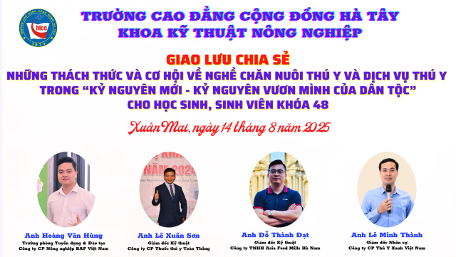 Sáng ngày 14/8/2025, tại Hội trường Hiệu bộ Trường Cao đẳng Cộng đồng Hà Tây, Khoa Kỹ thuật Nông nghiệp đã tổ chức chương trình giao lưu – chia sẻ với chủ đề “Những thách thức và cơ hội về nghề chăn nuôi thú y, dịch vụ thú y trong kỷ nguyên mới – Kỷ nguyên vươn mình của dân tộc” dành cho học sinh, sinh viên (HSSV) khóa 48.