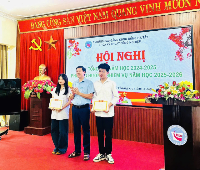 ThS. Nguyễn Văn Vinh – Phó Hiệu trưởng Nhà trường trao giấy khen cho HS Nguyễn Hữu Hải ( bên trái) đạt thành tích cao trong học tập tại Hội nghị Tổng kết năm học 2024 – 2025