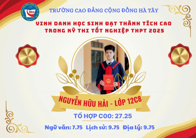 Trong kỳ thi tốt nghiệp Trung học phổ thông quốc gia vừa qua, em Nguyễn Hữu Hải, học sinh lớp 12C8 Trường Cao đẳng Cộng đồng Hà Tây, đã xuất sắc trở thành thủ khoa bốn môn thi với số điểm là 34 điểm và là Á khoa khối C00 của nhà trường với kết quả ấn tượng: 27.25 điểm. Trong đó Ngữ văn 7.75, Lịch sử 9.75, Địa lí 9.75 và Toán 6.75.