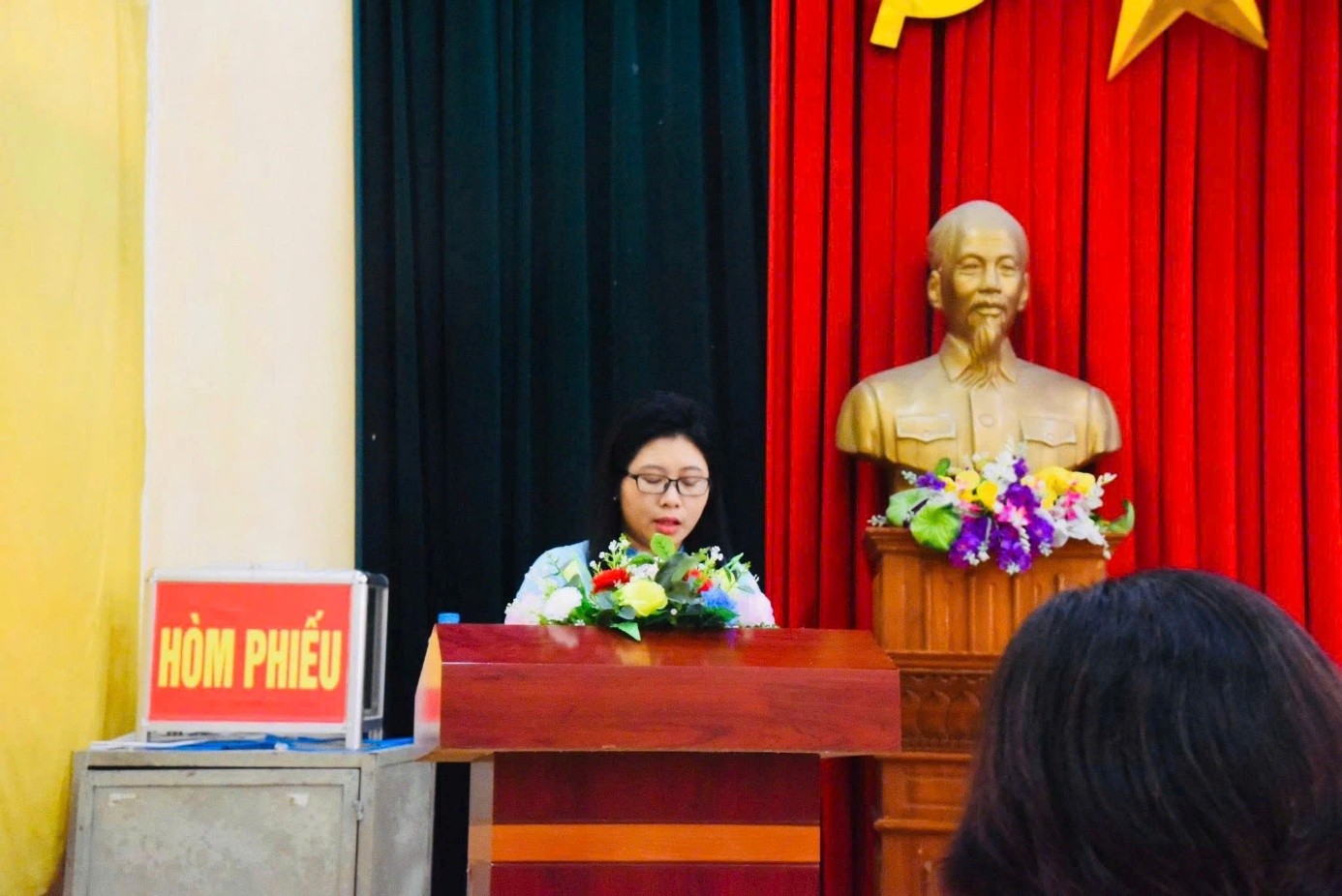 Đồng chí Lưu Thị Hồng Trang – Thay mặt Tổ Thư ký Hội nghị trình bày dự thảo Nghị quyết Hội nghị CBVCNLĐ năm học 2025-2026.